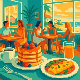 Stel, Peter heeft een geweldige ochtend en besluit zijn drie vrienden mee te nemen naar Cafe Loren Avalon om 18:00 uur diezelfde dag.