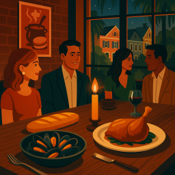 * Peter kan nu genieten van het diner met zijn vrienden bij Chez Nous Charleston!