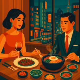 First, we were very attracted to the stainless bowls, cups, etc., gotta get some now. The Banchan was fresh and replenished without hesitation. The seafood scallion pancake was a cut above, lovely crisp edges. Galbi, Bi Bim Bap, and Tteokbokki (sp