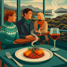 * Peter kan nu genieten van het diner met zijn vrienden bij Moss Restaurant Grindavík!