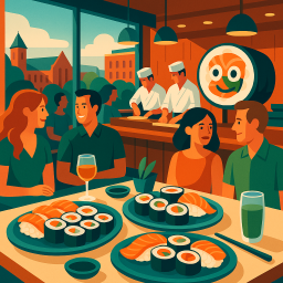 Stel, Peter heeft een geweldige ochtend en besluit zijn drie vrienden mee te nemen naar Sushi Nine Raleigh om 18:00 uur diezelfde dag.